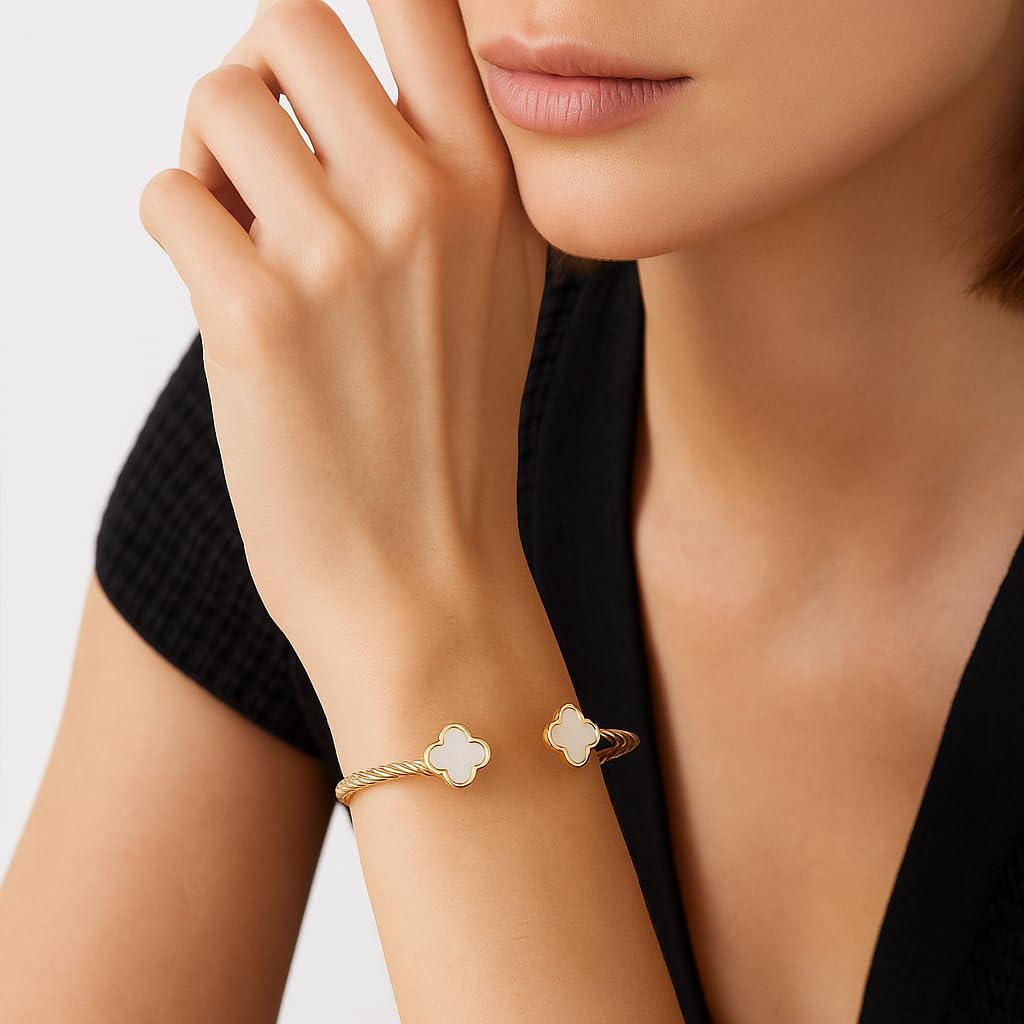 This 18K gold plated mother of pearl clover cuff bracelet for women is a stunning and timeless piece that blends elegance, symbolism and wearable sophistication. Featuring a twisted cable rope band and an open bangle profile, this bracelet showcases mother of pearl clover charms at each end for a glowing, feminine and luxury inspired finish. The open cuff structure offers flexible wear and makes this bracelet one size fits most, eliminating the stress of selecting a wrist measurement when purchasing for yourself or choosing a gift for someone else. The luminous mother of pearl brings a soft and radiant tone that catches the light beautifully, making this bracelet easy to dress up for evening events while still remaining subtle enough for daily wear. This clover charm bracelet is perfect for layering and styling with gold bangles, enamel bracelets, tennis bracelets, chain link cuffs and other clover pieces to create curated stacking looks. The combination of mother-of-pearl and gold plating creates a seasonal versatility that complements winter color palettes, sweater outfits, evening coats and polished holiday styling. This piece also transitions seamlessly beyond the holiday season and remains wearable all year round, making it a jewelry box essential that will continue to feel relevant and elevated. As a holiday gift for women, this bracelet offers meaning, beauty and timeless charm while remaining accessible and luxurious feeling, making it a perfect Christmas gift idea for birthdays, holidays, anniversaries and special celebrations.