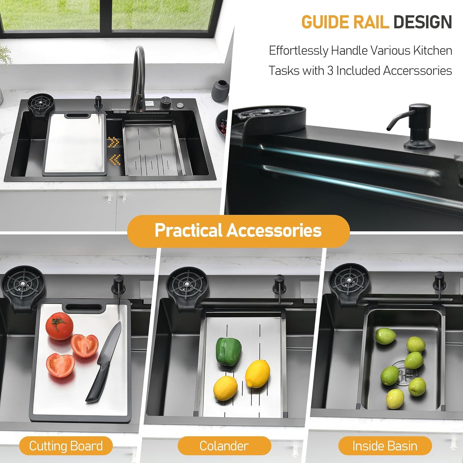 MWIDCIEW Waterfall Kitchen Sink – Dark Gray Nano Stainless Steel Upgrade your kitchen with the MWIDCIEW Waterfall Kitchen Sink, designed in elegant dark gray and crafted from durable 3D nano stainless steel. This multifunctional single bowl sink is equipped with premium accessories and smart innovations to make everyday cooking and cleaning easier, faster, and more enjoyable.Why Choose MWIDCIEW?✔ Complete set with all essential accessories included ✔ Durable 304 nano stainless steel construction✔ Sleek and modern waterfall faucet design ✔ Flexible 360° pull-down faucet with 3 spray modes ✔ Space-saving dual guide rail system for efficient workflow The MWIDCIEW 27" Waterfall Kitchen Sink is more than just a sink—it’s a smart workstation designed to make your kitchen tasks easier while adding modern elegance to your home. Perfect for busy households that value functionality, style, and durability.