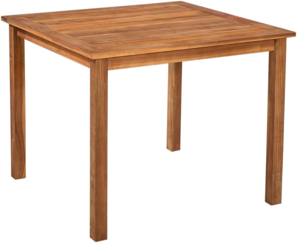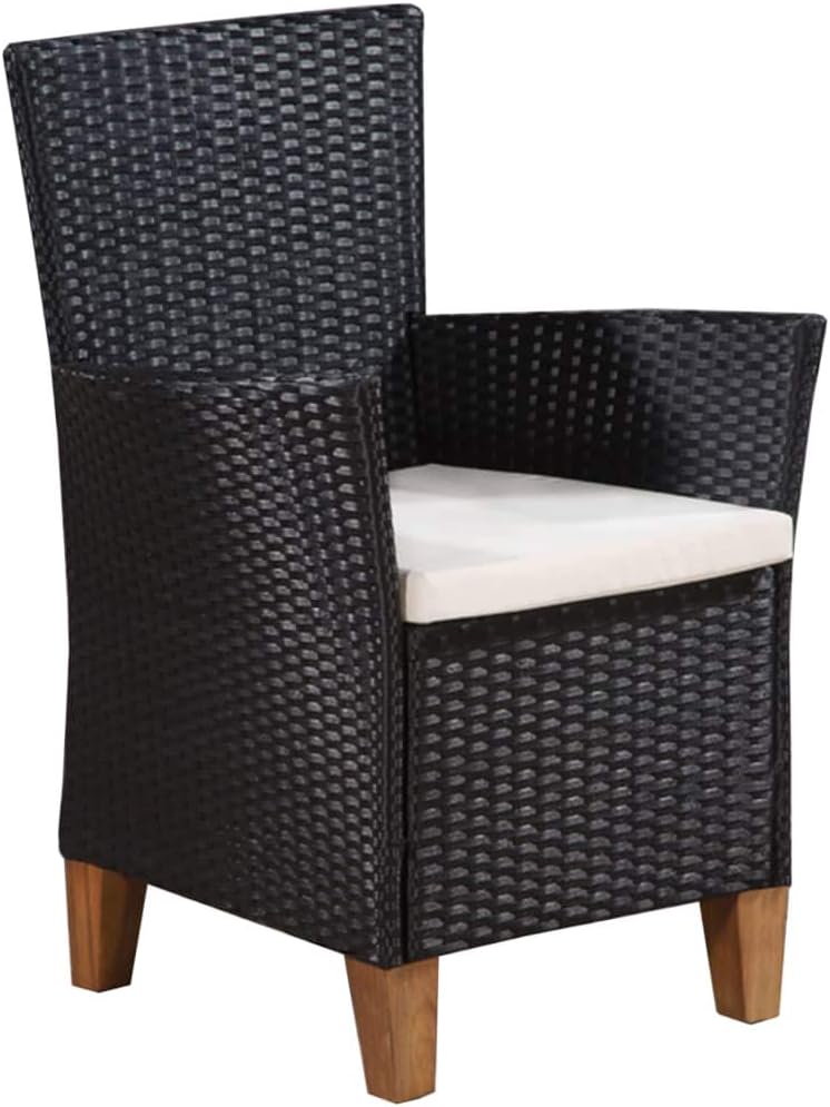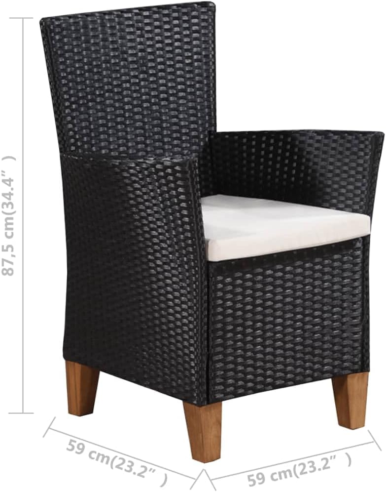 Enjoy a nice meal outdoors with your family and friends with our dining set!The patio table is made of solid acacia wood with an oil finish, which makes it sturdy and durable. It has a timeless design and exudes a rustic charm. Thanks to the water-resistant PE rattan, the armchairs are hard-wearing and easy to maintain. The steel frames and solid acacia wood feet make the patio chairs sturdy and stable. The dinner chairs are delivered with comfortable cushions. The low-maintenance polyester fabric cushion covers can be removed and washed if needed.The dining set is easy to assemble.Color: Black and brownCushion color: Cream whiteMaterial: PE (polyethylene) rattan, powder-coated steel, solid acacia wood (with a natural oil finish)Cushion cover material: 100% polyesterTable dimensions: 33.5" x 33.5" x 29.1" (L x W x H)Chair dimensions: 23.2" x 23.2" x 34.4" (W x D x H)Seat width: 16.1"Seat depth: 18.5"Seat height from the ground: 16.5"Armrest height from the ground: 25"Cushion thickness: 1.6"Assembly required: YesDelivery contains:1 x Table4 x Chair4 x Seat cushion