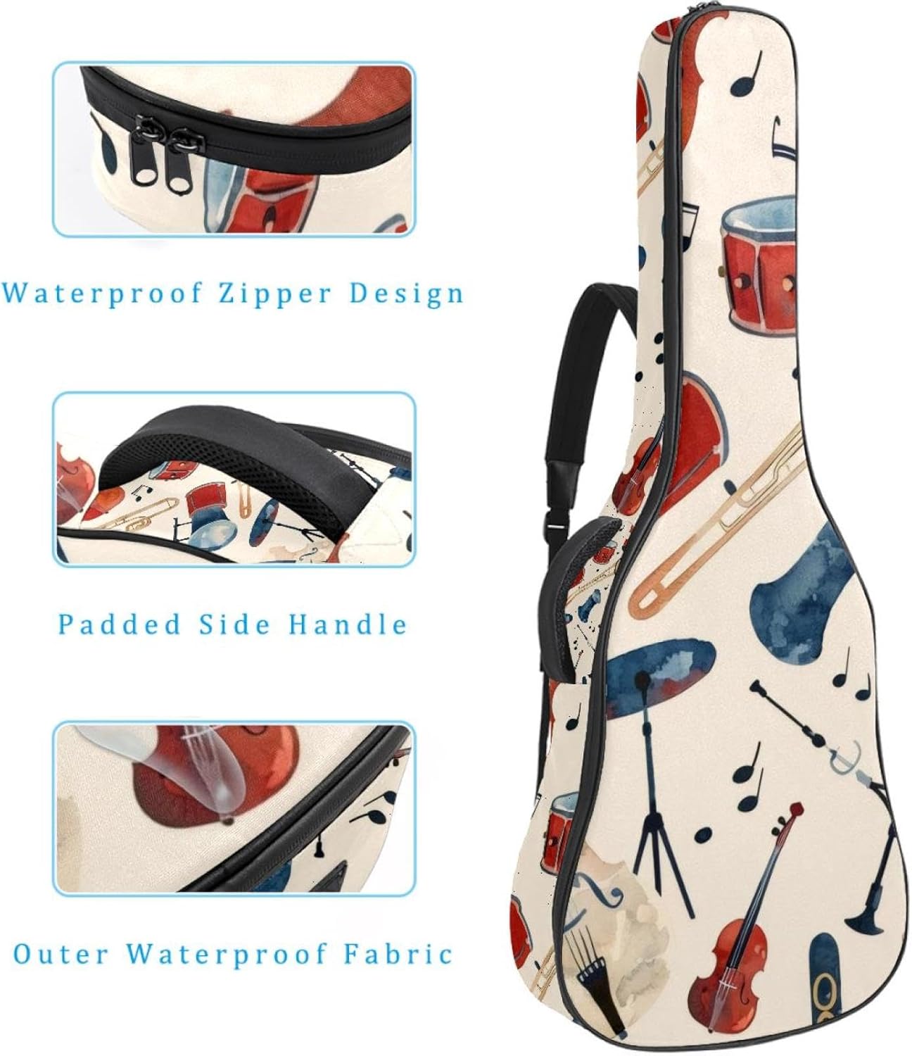 Specifications:Material: waterproof Oxford and waterproof zipper;Size: 42.9’’ x 16.9’’ x 4.7’’, perfect for 40'' 41'' 42'' guitar;Weight:36oz/1020g, lightweight;Color: Multi-color.Features:1. Adjustable backpack shoulder straps and padded side carry handle for more pleasant carrying choices.2. 10mm thick sponge padding inside provide protection for your musical instrument; and fixed Velcro above neck and body keep your acoustic guitar bag safer.3. This guitar bag comes with back hanger loop can be hung on the wall. Save more space when not in use.4. Two pockets for storage convenience, 1 large capacity pocket on outside back and 1 small pocket on the inside neck.5. Cute printed guitar gig bag guitar case backpack, ideal as a gift for your relatives or friends who love music when birthday, Thanksgiving, Christmas, holidays, and other special events.