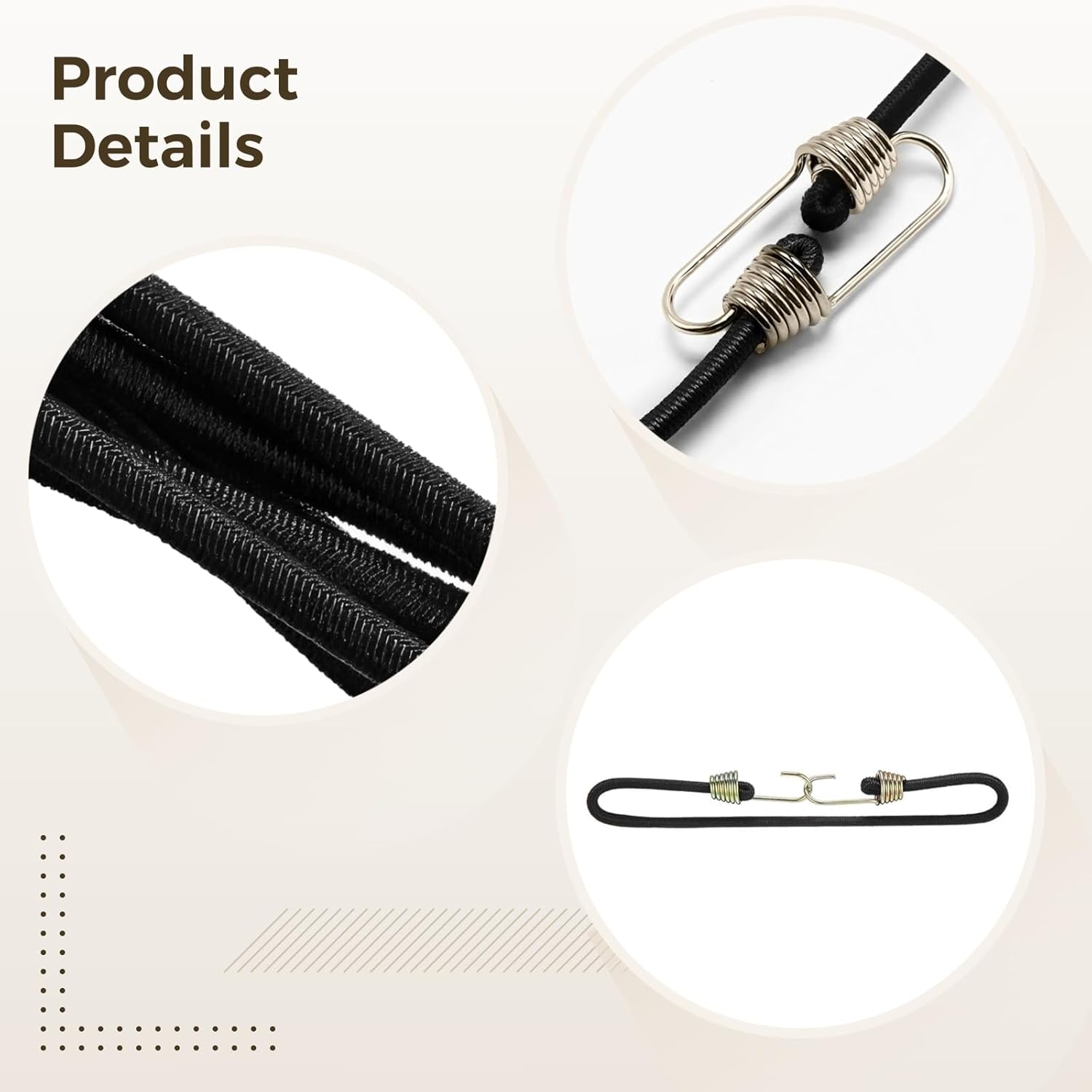 Color:black Material:latex+alloy Product Size: 9.84 x 0.39 in / 25.0 x 1.0 cm Package Includes:bungee cord * 50 Note: - Please refer to the measurement. Tiny measuring error is allowable in normal range. - There might be a little color difference due to the monitor, camera or other factors, please refer to the physical item.