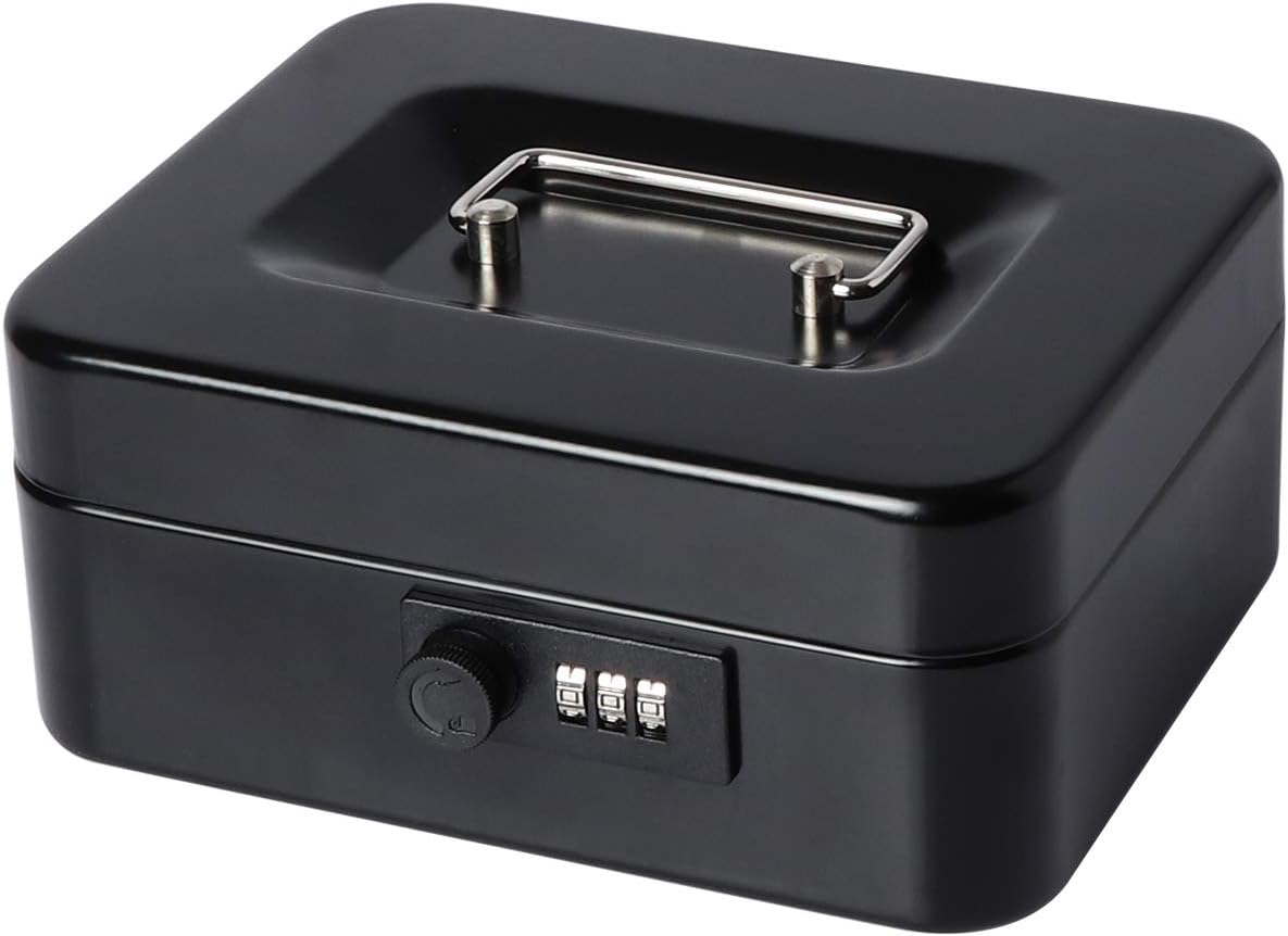 Cash Box with Combination Lock, Metal Money Box for Cash, Lovndi Lock Box with Money Tray, 9.84x 7.87x 3.54 Inches, Black