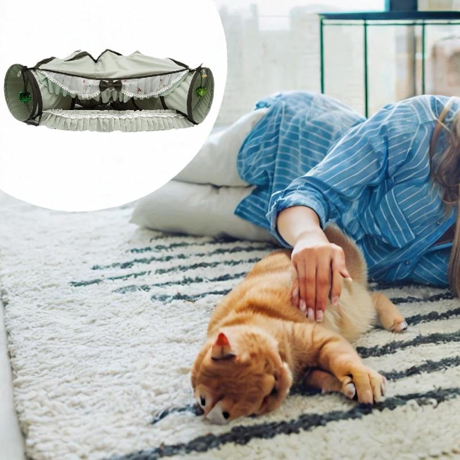 Description:- 【Versatile Cat Tunnel Bed】: This multifunctional cat tunnel bed offers fun and relaxation for your pets. Cats can play, rest, sleep, hide, and have joyfully with its soft cushioning, tunnel design, and attached ball toy. It's an ideal combination of a cat bed, toy, and tunnel- 【Adjustable Design】: The Cat Activity Center can be configured into a curve or straight line to suit your space. With a straightened length of approximately 126cm/49.61inch and an assembled total length of about 96cm/37.80inch, entrance diameter 27cm/10.63inch, nest cushion length approximately 76cm/29.92inch- 【Premium Materials】: Cats Tunnel Tubes Toys, made from smooth polyester with cool beans material for the cushion. The removable cushion is easy to clean and features a non slip bottom to keep from movement- 【Easy Storage & Portability】: This 2 in 1 Cat Tunnel and Bed Toy Set can be easily dismantled and folded using buttoned straps for convenient storage or transport, suitable for outdoor use with your pet- 【Ideal Gift for Cat Lovers】: An ideal choice for cat enthusiasts or those with other small pets; this Rabbit Tunnel Bed Nest makes an ideal birthday or holiday gift that will surely delight pet companion with its ballSpecification:- 1. Please remove the mat, channel, and curtain during cleaning;- 2. Prepare the laundry and soak it in water for 5-10 minutes;- 3. Clean with clean water again;- 4. The channel cannot be machine washed, and it is recommended to put the curtains and mats in a laundry bag for machine washing.Size Chart:Tunnel entrance diameter approximately: 27cm/10.63inch