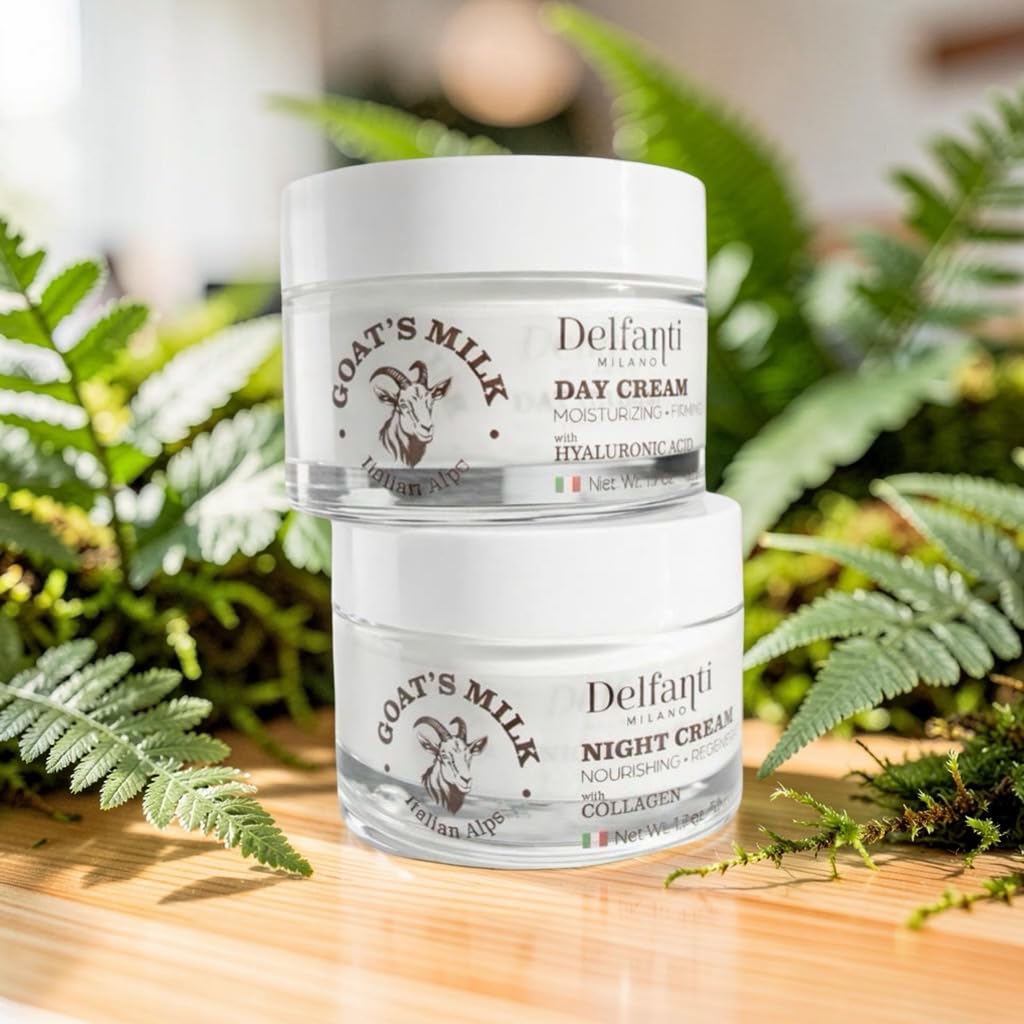 FULL SIZE DUO PACK, DAY and NIGHT MOISTURIZING ROUTINE This complete face and neck duo pairs two full size creams for around the clock care. The Day Cream with Goat’s Milk and Hyaluronic Acid helps deliver lasting hydration and softness, while the Night Cream with Goat’s Milk and Collagen helps nourish and comfort skin as part of your evening routine. Both formulas are designed to leave skin feeling smooth, conditioned, and deeply moisturized without a heavy finish. With regular use, skin looks softer, more refreshed, and better supported through day and night. DAY CREAM, DAILY HYDRATION The Day Cream helps replenish moisture and improve comfort with Goat’s Milk, Hyaluronic Acid, Shea Butter, and supportive skin conditioning ingredients. It absorbs well and wears comfortably through the day. NIGHT CREAM, NOURISHING CARE The Night Cream helps restore softness and maintain hydration overnight with Goat’s Milk, Collagen, Shea Butter, and skin conditioning ingredients for a smoother, more supple feel by morning. HOW TO USE Apply the Day Cream every morning to clean, dry face and neck. Apply the Night Cream every evening to clean, dry face and neck. Massage gently until fully absorbed. Made in Italy Net wt 2 x 1.7 oz jars