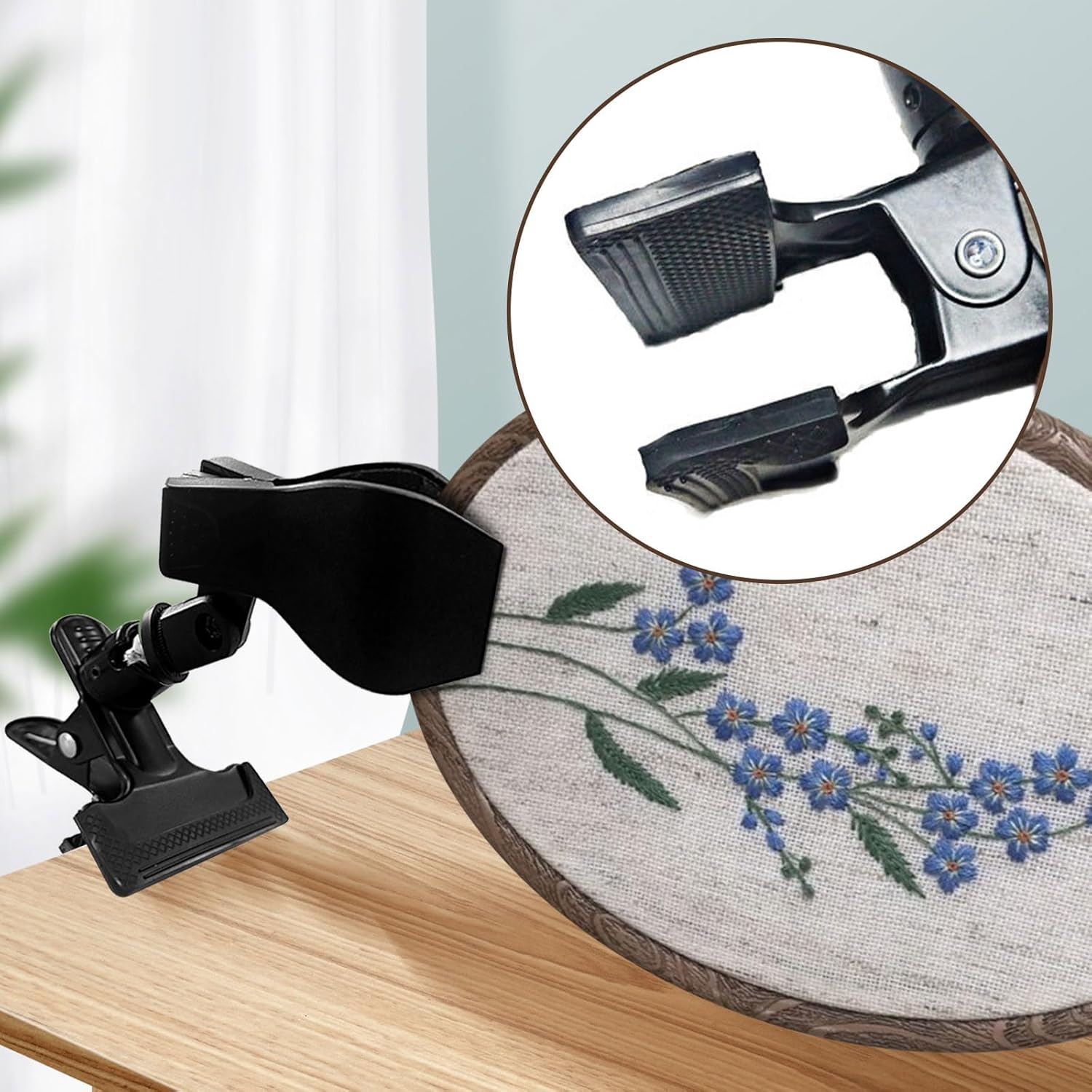Features: There is a built-in rubber pad that easily clips onto a 1.57-inch/4-centimeter-thick tabletop and rotates the frame 360 degrees at any time. Specifications: Color: Black Mounting Type: Clip On Special Feature: Lightweight Material: Metal Size: Opening Up to 1.57inch Package Includes: 2 x Embroidery Hoop Holder Clip Notes: 1. Please allow a little error in the size due to manual measurement. 2. The color might exist slightly difference due to different displays.