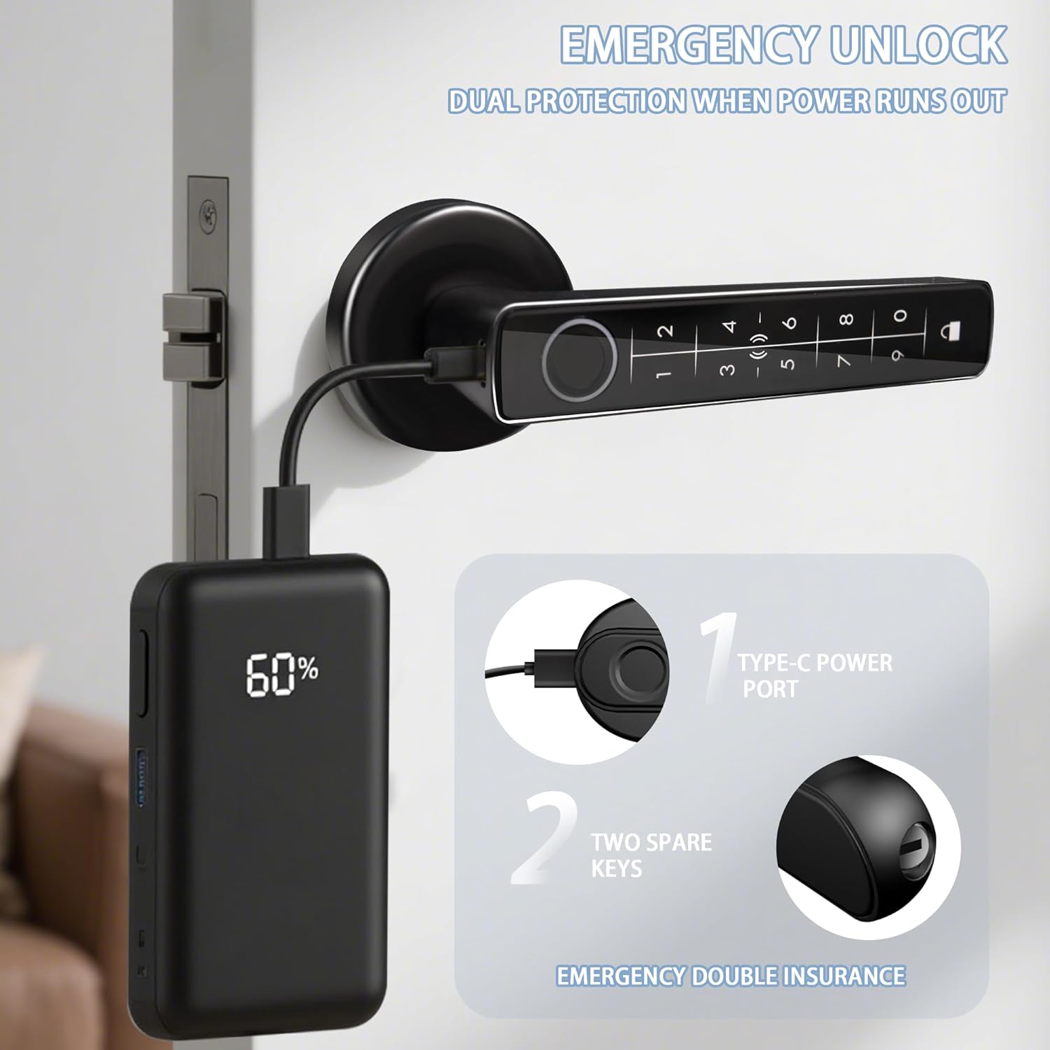 • Biometric Sensor with Emergency Power Supply: Equipped with an optical sensor to enhance recognition accuracy and reduce false rejection rates. Supports temporary emergency charging via a Type-C interface for connecting charging cables, and features a low-battery warning function (this product does not include a battery; a battery must be purchased separately).