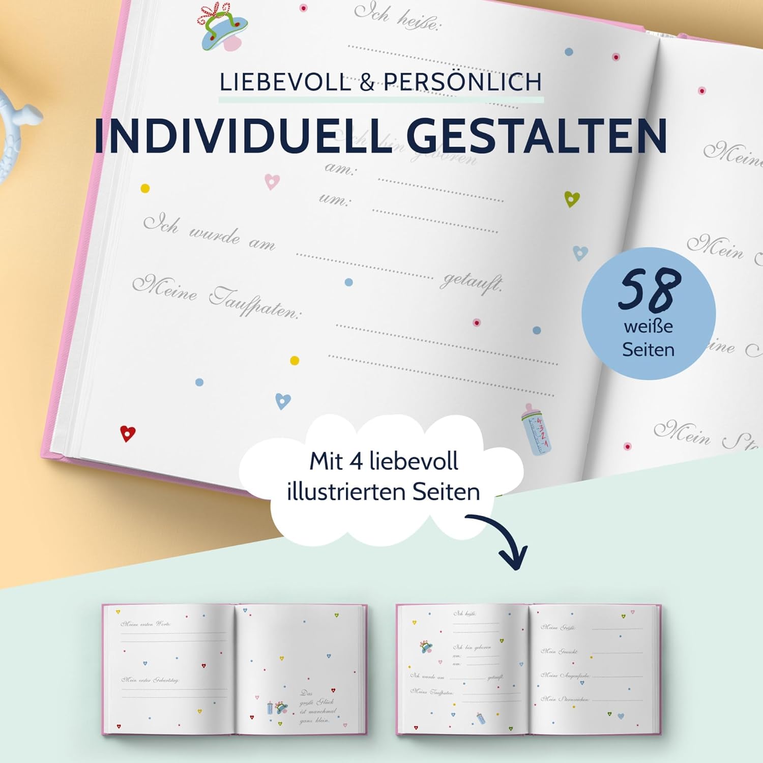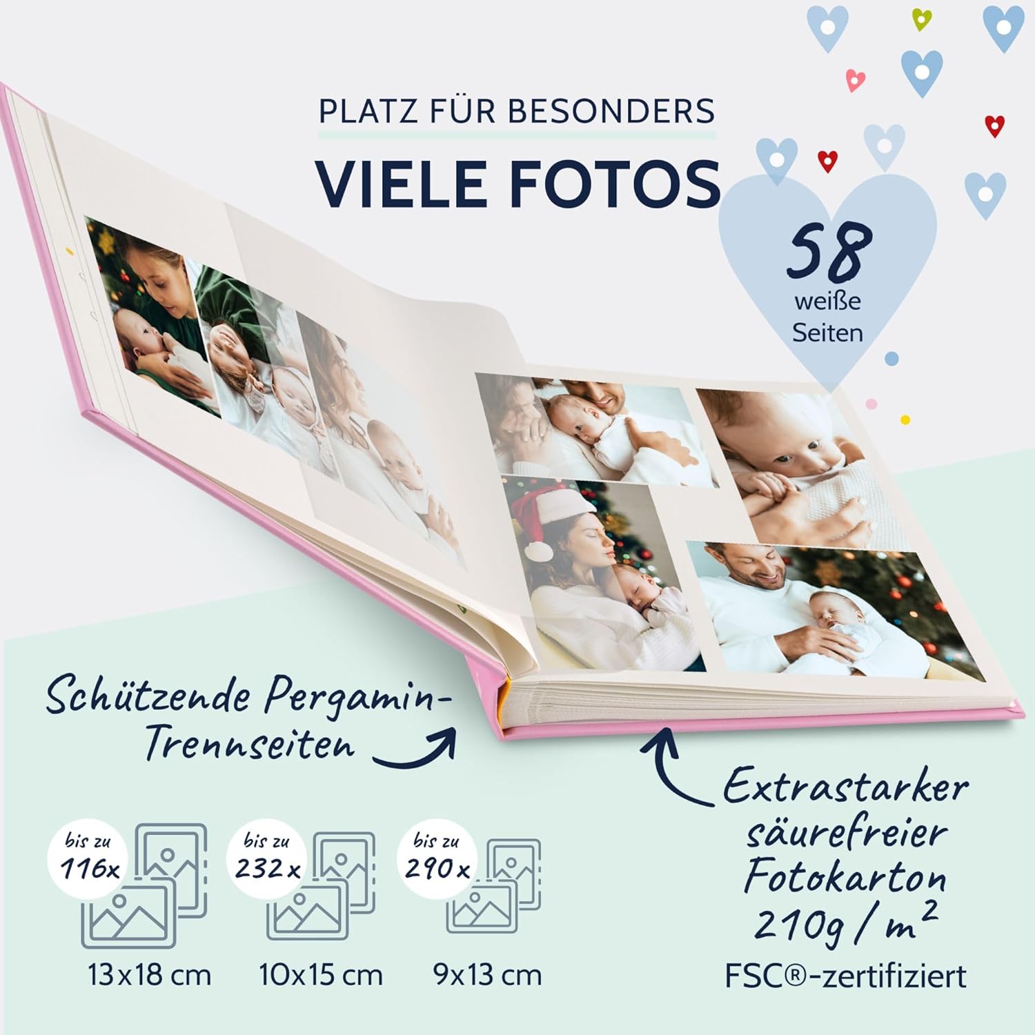 Memories from experiences – the colourful baby album Little Princess for the most beautiful moments is an ideal gift for a birth, christening or birthday. You can use it as a classic photo album or to create a custom scrapbook album. The cover is made of art print and has been designed with the inscription "Little Princess" and a small loop. - Space for the most beautiful memories - The photo album has a size of 30 x 31 cm. On 62 white pages, 4 of which are illustrated and 58 blank, pictures can be attached using photo taps, photo corners, photo scooters or photo glue. Overall, the album offers space for approx. 360 photos in standard format 9 x 13 cm. Thanks to the blank pages, you can let your creativity run wild and personalise your memories. In addition, the album contains 4 illustrated pages for entering text. The glassine interleaves protect the images from yellowing, sticking or swelling. - INDIVIDUAL DESIGN - The experience comes to life again. Design your album according to your own idea or complement your album with individual labels. The blank pages offer you enough space and creative space. Since 1907, Goldbuch has been producing high-quality stationery and stationery products in excellent quality from its main location in Bamberg. Discover our passion for selected materials, first-class workmanship and the perfect design. With a high quality standard for design and product ideas, Goldbuch follows the trend of time and offers a wide range of sophisticated albums and stationery products. Put your most beautiful moments in style. The bound pink baby album made of art print with relief varnish and accessories has 60 white pages with glassine interleaves, as well as 4 illustrated pages. Goldbuch – quality since 1907