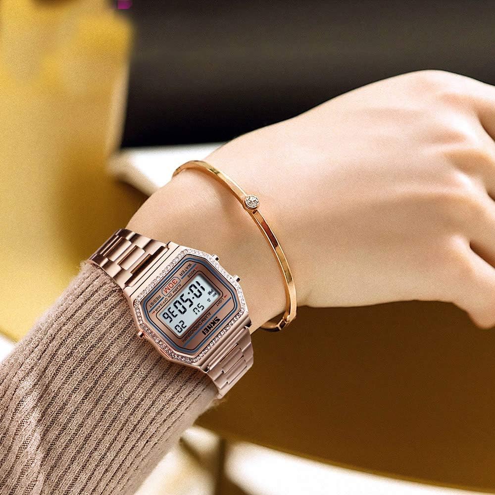 Item Type:Digital Wristwatches Gender: Women/ Female Style: Fashion & Casual/ Dress Colors: Black/ Rose Gold/ Gold/ Silver Case Material: Alloy Band Material: Stainless Steel Buckle type: Bracelet Clasp Watch of Dial: Round Dial Diameter: 34mm Case Thickness: 9mm Band Width: 14mm Wristband Length: 230mm Water Resistance Depth: 30M Product Weight: About 56g Functions: 30M Water Resistant/ Chrono/ Alarm/ Date/ Week/ EL Light/ 12/24 Hour Package 1X*watch,1*Operation Manual Waterproof description (life waterproof ),only can splash a little water,can't be washed or in bathing,swimming,diving.