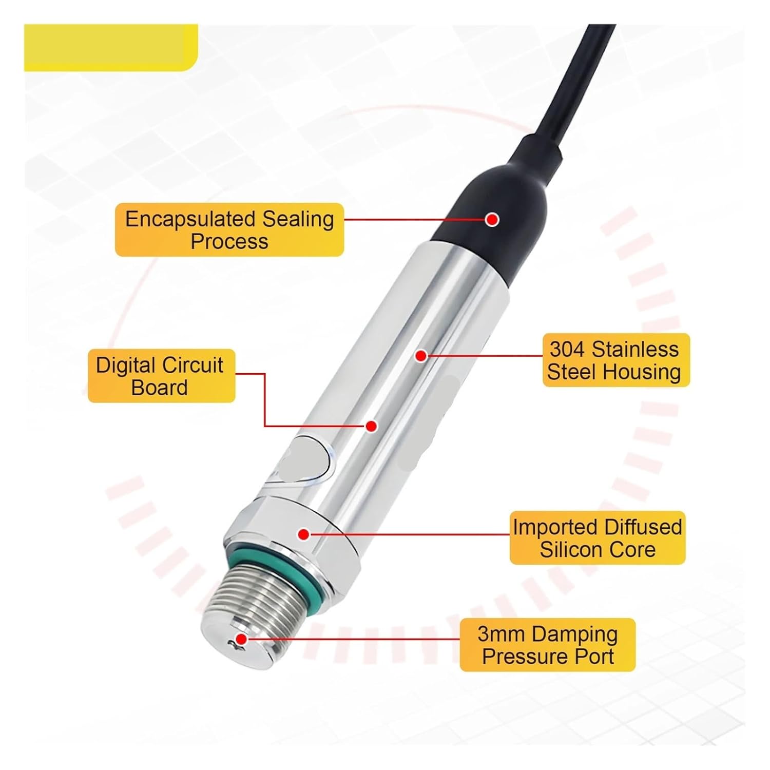 1,NOTEDue to page limitations, some configurations may not be listed. Please contact us .Default Configuration:Cable Length: 1.5MPower Supply: DC24VSignal Output: 4-20mAProtection Rating: IP68Customizable Options:Power Supply: 9~24VDCSignal Output Types: 4-20mA, 0-5V, 0-10V, RS485Cable Length: 10M, 15M, 20M, etc.For custom requirements, please contact us2.ParametersParameterDetailsModelHTP-300YMeasurement Range-100kPa...0~1kPa...100MPaOutput Signal4-20mA, 0-5V, 0-10V, RS485Supply Voltage9-24VDC, 3.1-5VPressure TypeGauge, Absolute, SealedAccuracy±0.5%FS (typical), ±0.2%FS, ±0.1%FSCompensated Temperature-10~70°COperating Temperature-20~80°CZero Temp Drift±0.5%FS (max)Sensitivity Temp Drift±0.5%FS (max)Overpressure2x (10MPa), 1.5x (>25MPa)Vibration Resistance20G (20-5000Hz)Sampling Rate2400 samples per secondProtection LevelIP68Material CompatibilityCompatible with 316L stainless steelEnclosure MaterialAluminum alloy, polyurethane cableResponse Time10msInsulation Resistance100M/250VDC3.FeaturesHigh AccuracyAchieves up to ±0.1%FS precision for dependable and accurate pressure readings.Customizable ConfigurationsFlexible options for power supply (9~24VDC) and signal outputs (4-20mA, RS485) to meet various requirements.Durable and ReliableConstructed with 316L stainless steel and rated IP68 for optimal performance in tough environments.Wide Temperature CompatibilityOperates efficiently in conditions with a temperature range of -20°C to 80°C.Fast Response TimeOffers a rapid 10ms response for real-time pressure monitoring.4.ApplicationsConstant-pressure water supply systemsHydraulic systemsLiquid level monitoringEnergy production5.FAQsQ: Can the cable length be customized?A: Yes, cable lengths such as 10m, 15m, and 20m can be customized.Q: What types of media are supported?A: It is compatible with fluid media that do not corrode 316L stainless steel.Q: What is the device's protection rating?A: The device is IP68-rated, ensuring excellent resistance to water and dust.Origin : Mainland ChinaMeasurement Range : -100kPa...0~1kPa...100MPaOutput Signal : 4-20mA, 0-5V, 0-10V, RS485Supply Voltage : 9-24VDC, 3.1-5VProtection Level : Protection Level