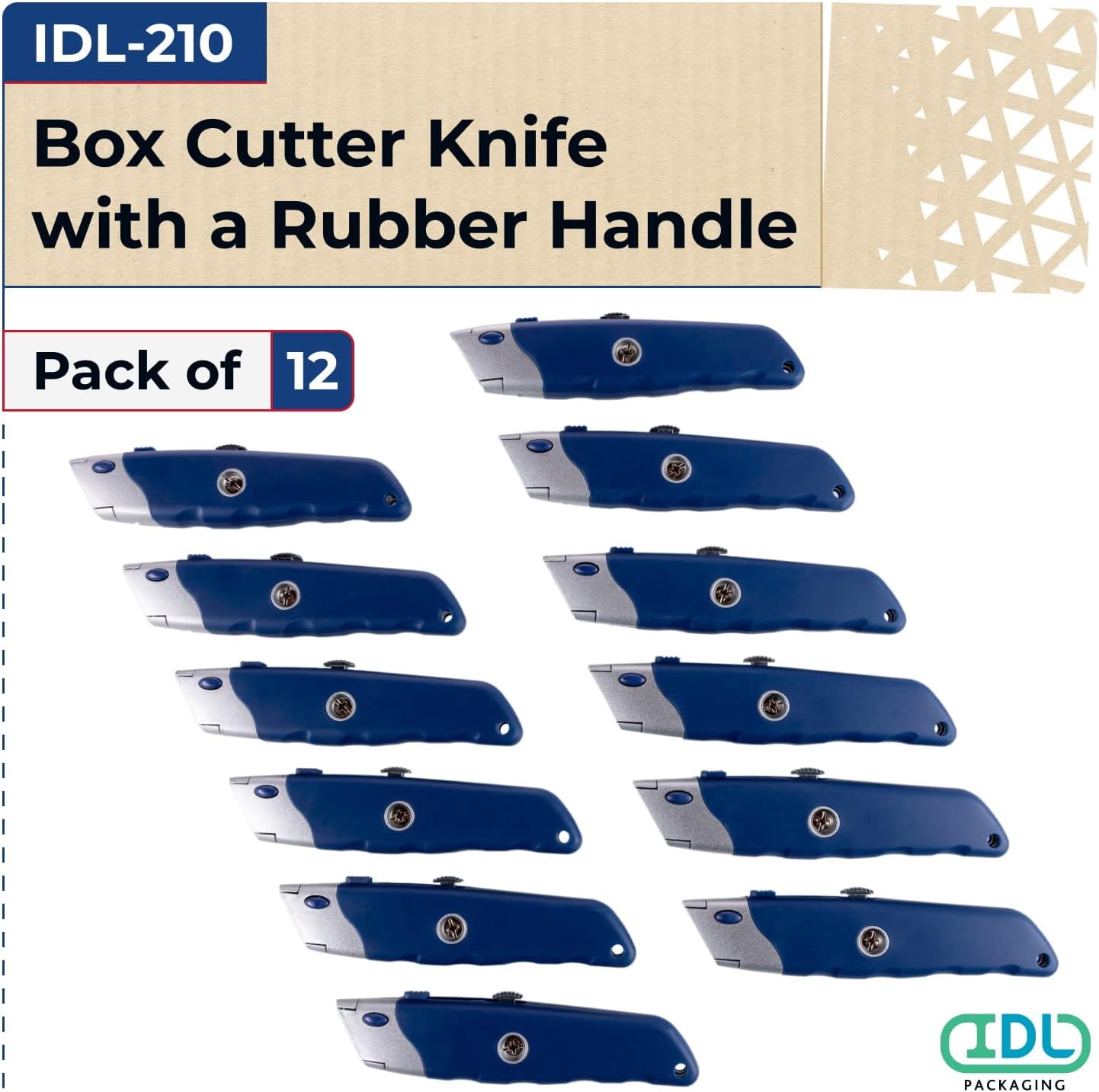 We offer the IDL-210 Retractable Box Cutter. It is a durable and heavy-duty box opener tool that features a retractable steel knife.The versatile design makes it easy for one-handle operation. The retractable blade lock function of our box cutter ensures safety when you need precision cuts or notches on delicate products. All without wearing out after just a few uses, like traditional knives.This small box cutter is a must-have for any professional who needs to open or resize cardboard boxes. The sharp steel blade will not bend or break, so you can be sure it's going to withstand the pressure!In our IDL Packaging Amazon Brand Store, you can find packing boxes in a wide variety of sizes (small, medium, large) and shapes (long, tall, cube, letterhead, flat, etc.). We offer a large selection of packing materials and tools. Please choose the one that suits you.
