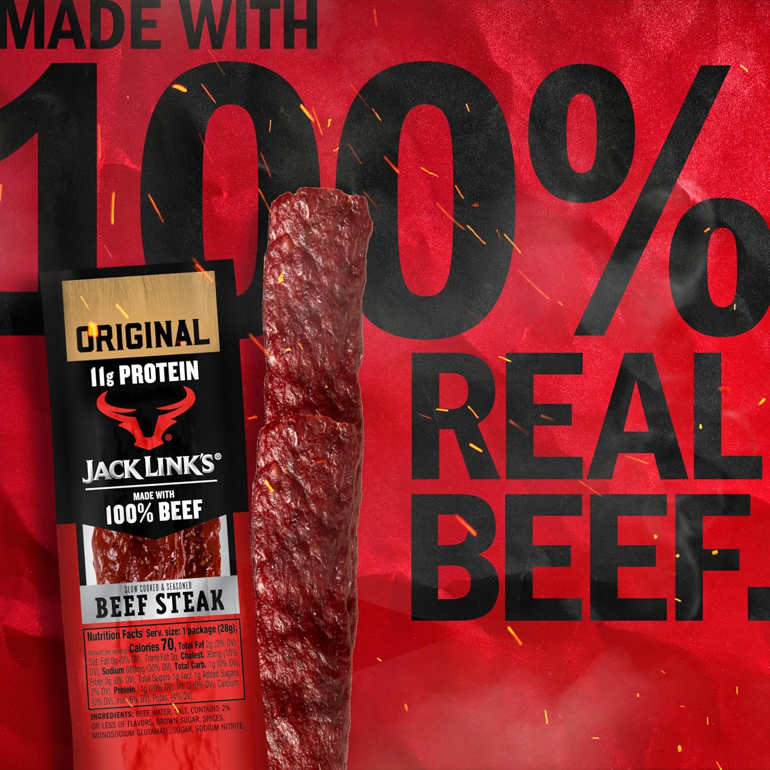 Jack Link's Beef Steak is crafted from lean, 100% premium beef and seasoned with Jack Link's signature Original spice blend. Slow-cooked over hardwood smoke, these tender, savory steak bars deliver classic jerky flavor and 11g of protein per serving. This pack includes 12-1-ounce individually wrapped beef steaks that are perfect for packing in lunches, bringing to work, tossing in backpacks, or taking along on road trips, camping, or kids' activities. Ready to eat and easy to store, they're a great protein snack option for families who get their chomps on the move. When you open a Jack Link's meat snack, you get a taste of the American tradition that has made this family-owned brand a favorite for generations through hard work, fun, and quality products.