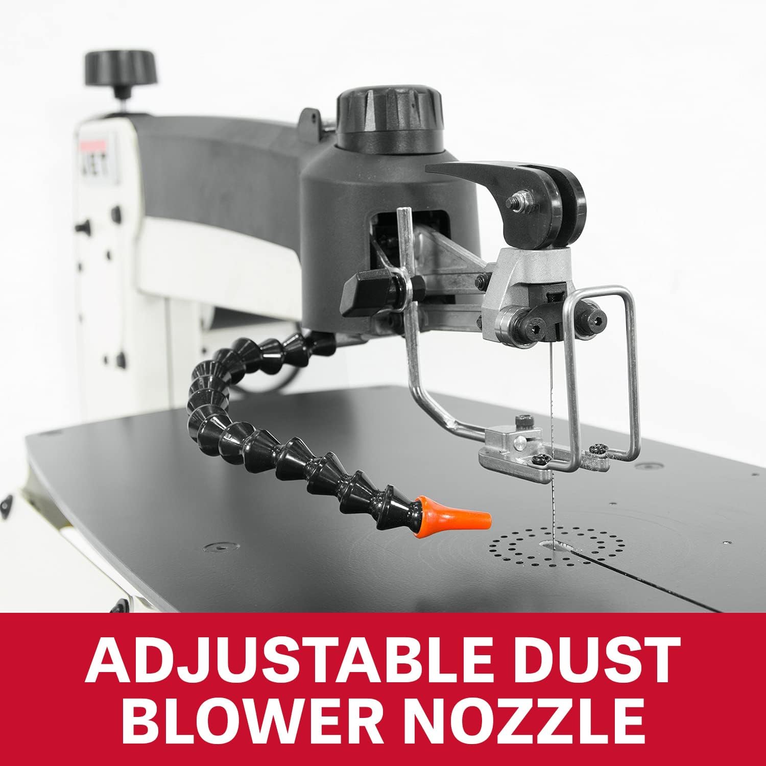 Say hello to the JET 22-inch scroll saw. Combining best-in-class features, with innovation and thoughtful design, to create the machine you've been waiting for. The best part about this saw is the blade change process. Our exclusive upper mechanism clamps and tensions the blade in one step. In addition to the upper mechanism, the toolless lower blade holder is removable and the table features a slot for the blade.The features don't stop there: this saw offers 22 inches of throat capacity, and an arm that tilts 40° left and 45° right. This saw is designed to optimize your scrolling experience. From the variable-speed range, to a top-lift spring-loaded arm, this saw comes fully loaded with all the features you’d expect from JET Tools.