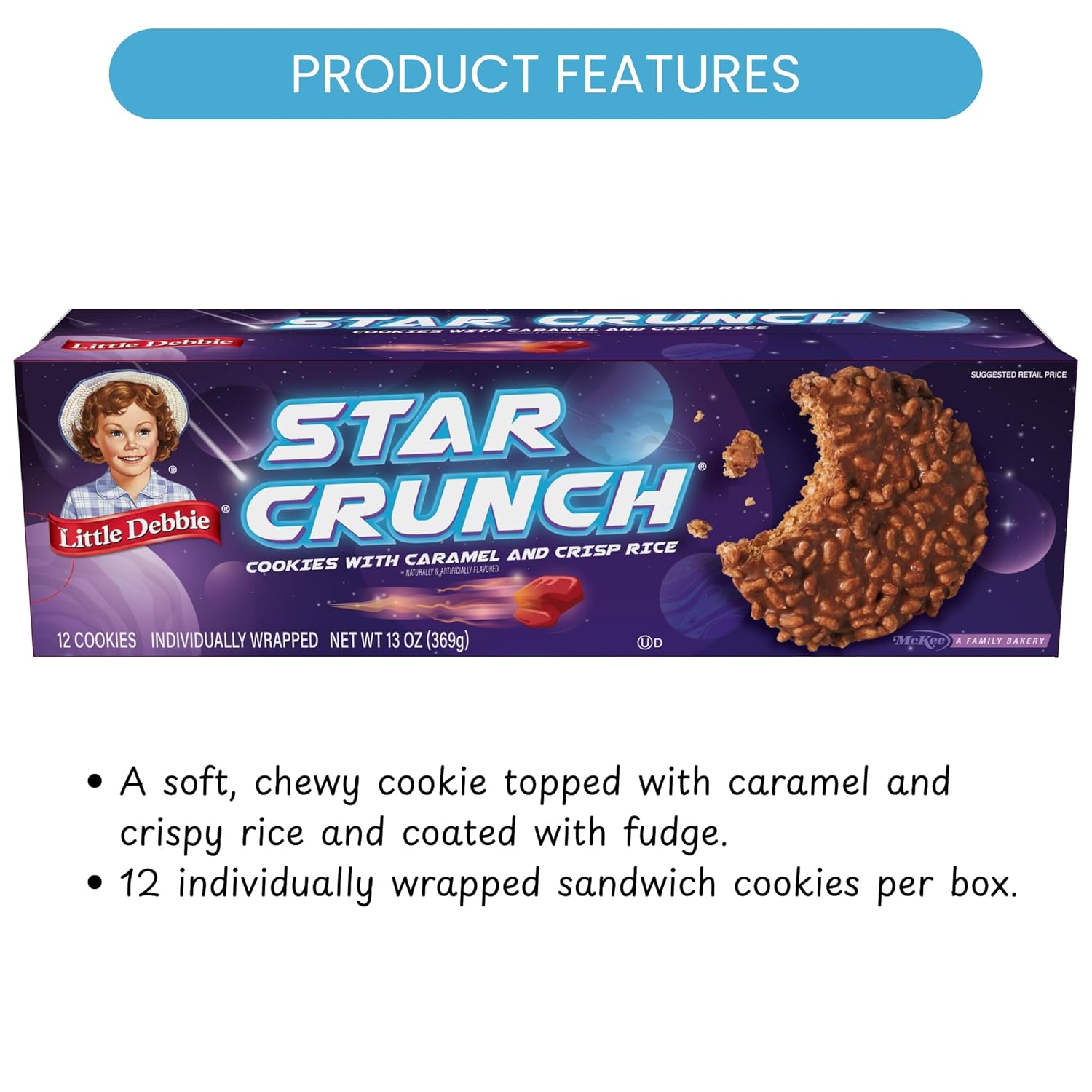 Ready to blast your taste buds off on a stellar adventure? Little Debbie Star Crunch Cosmic Cookies are the perfect treat for any mission! A classic that can’t be easily imitated, these soft, chewy cookies are topped with out-of-this-world caramel and crispy rice, then eclipsed by a coating of fudge. You will fall for these delicious stars in no time! Grab a box for your next blastoff to work, school or any place in between. The best part? You can order online, because these sweet treats are not lightyears away!