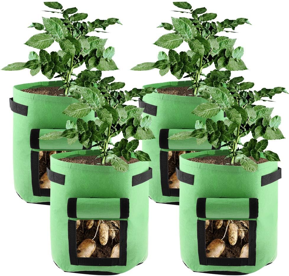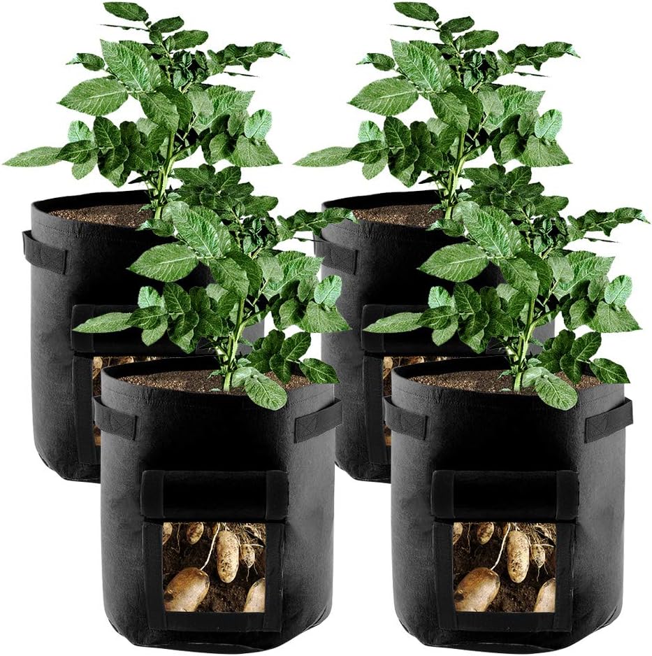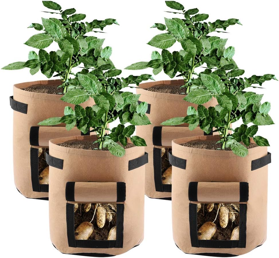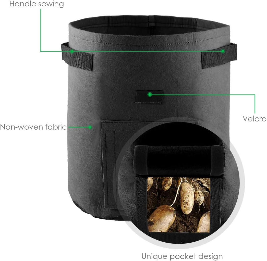 Potato Grow Bags 7 Gallon Potato Vegetable Garden Planter Bag with Flap Handles Nonwoven Aeration Fabric Pot Growing Container for Planting Potato Carrot Tomato OnionFeatureMade of non-woven fabric material, flexible design, anti-corrosion, moisture-proof and breathable.Excellent for planting potatoes, carrots, onions, and many other vegetables.Sturdy fabric grow bags, good for long time use.Breathable window design on the side that can be opened and closed easily.Designed with handles, convenient for moving the planter bag around.Easy to use, perfect for planting in your home balcony, garden, patio or other places.SpecificationMaterial: non-woven fabricCapacity: 7 gallonGrow Bag Weight: 150g Plant Bag Size: 300*350mm/11.81*13.77inPackage List:5 x Grow Bags 7 Gallon