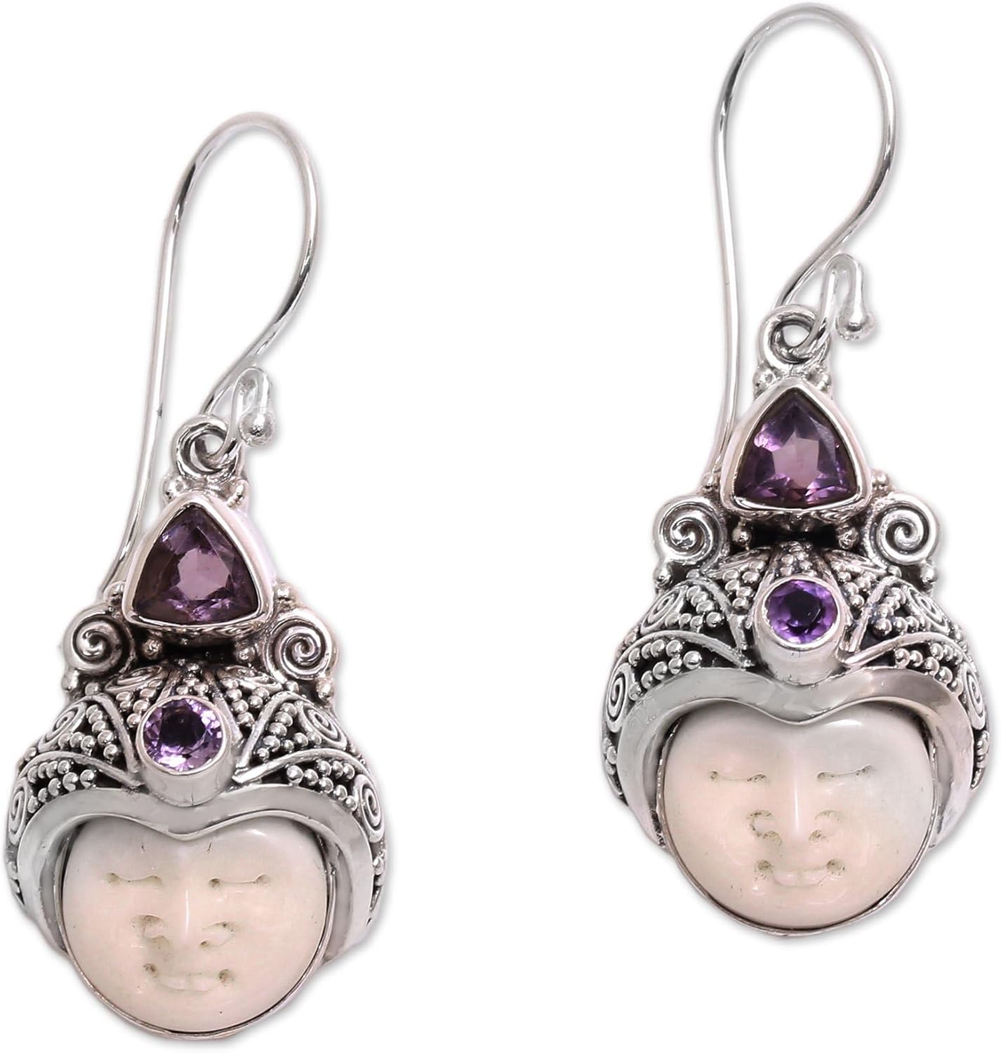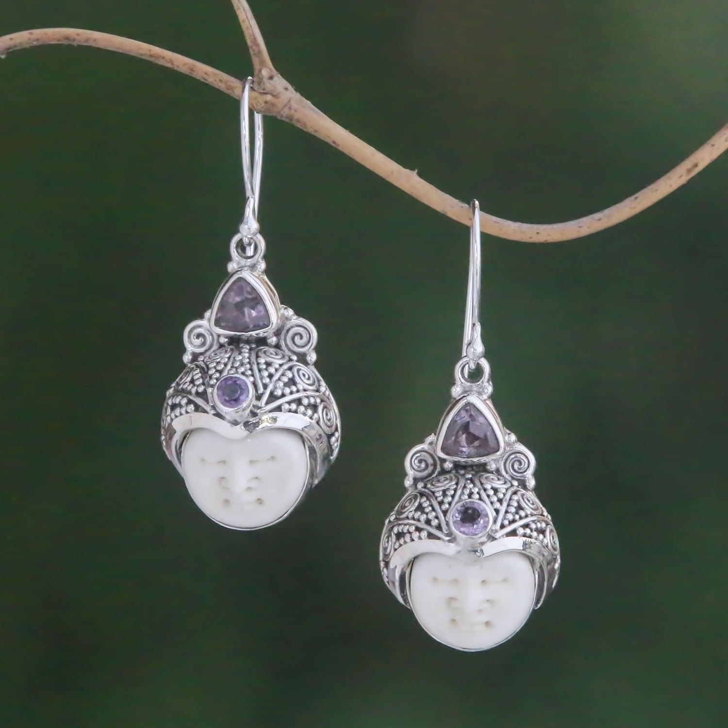 Novica works together with talented artists, artisans, and designers around the world to produce stunning, keepsake handmade treasures. Our mantra is to Spread Happiness, so rest assured - we’ll do everything we possibly can to ensure you’re a happy customer!About this item: Two princes, their faces carved in bone, wear ornate crowns that are handcrafted of sterling silver with elegant wire and dot work patterns. Komang Suastra designs and crafts this pair of dangle earrings, accentuating the crowns with faceted amethyst gems. He names the earrings Celuk Pangeran, "Celuk" referring to the silversmithing village where he works and pangeran meaning "prince" in Indonesian.About our Artist: 'I've wanted to create silver jewelry since I was in elementary school. By the time I was in junior high, I was crafting my own pieces, thanks to a friend's parents who are silversmiths,' Komang Suastra says. 'When I finished high school, I set up my own workshop and started crafting jewelry there. Creating new designs is very exciting.'...