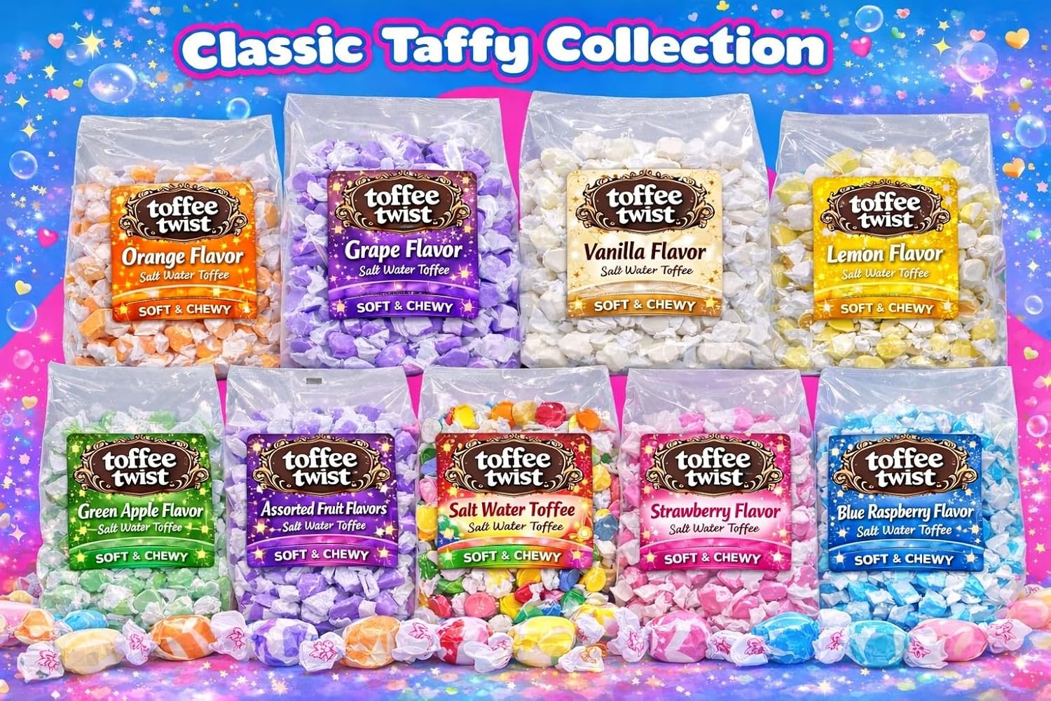 Indulge in a sweet and chewy treat with this delicious assortment of toffee Taffy Town’s Salt Water Taffy. This bag features 12 fun and flavorful varieties, offering a perfect mix of fruity, creamy, and classic candy favorites that everyone will love. Each piece is soft, smooth, and bursting with flavor, making it a perfect treat for sharing, parties, candy buffets, or simply satisfying your sweet cravings. Perfect for snacking, gifting, celebrations, weddings , candy lovers of all ages.