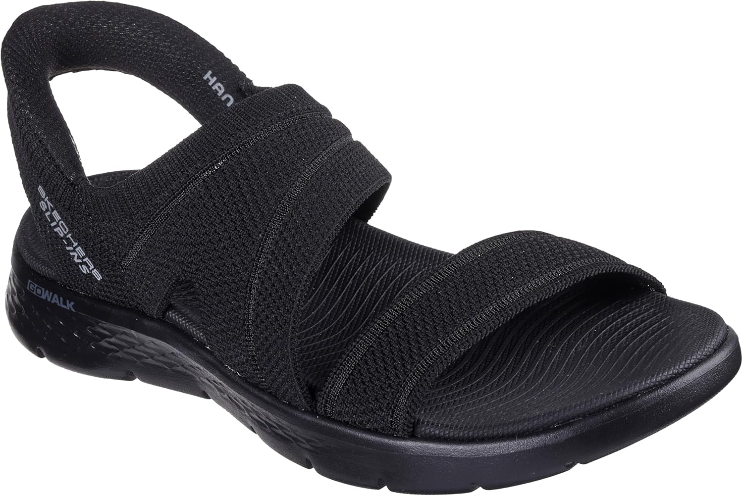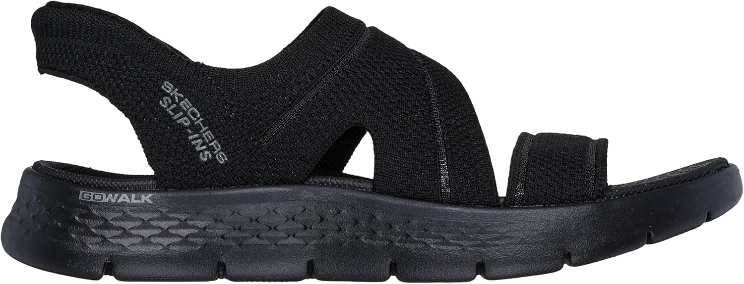 Experience an effortless way to wear your favorite sport sandal with Skechers Hands Free Slip-ins: GO WALK Flex Sandal - Enticing. Designed with our Heel Pillow, this strappy slip-on sandal features a knitted upper with a back heel piece, contoured Goga Mat footbed and lightweight ULTRA GO cushioning.
