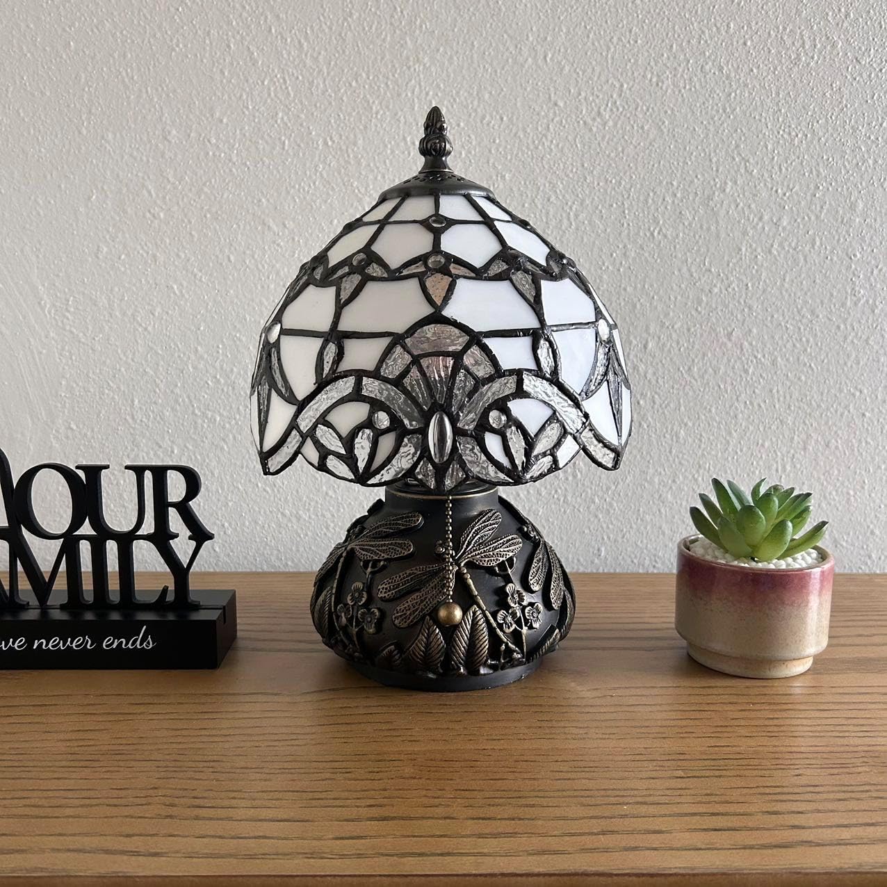 Resin Base with bronze finish. Each piece of stained glass is hand-soldered into place using the traditional copper foil technique.
